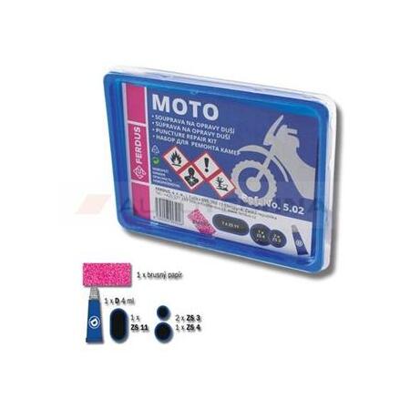 Opravná sada MOTO Súprava na opravu duší pre motocykle obsahuje: - 1 x brúsny papier - 1 x vulkanizačný roztok D 4ml (lepidlo) - 1 x záplatu ZS 11 (75 x 35mm) - 2 x záplatu ZS 3 (priemer: 37mm) - 1 x záplatu ZS 4 (priemer: 46mm)